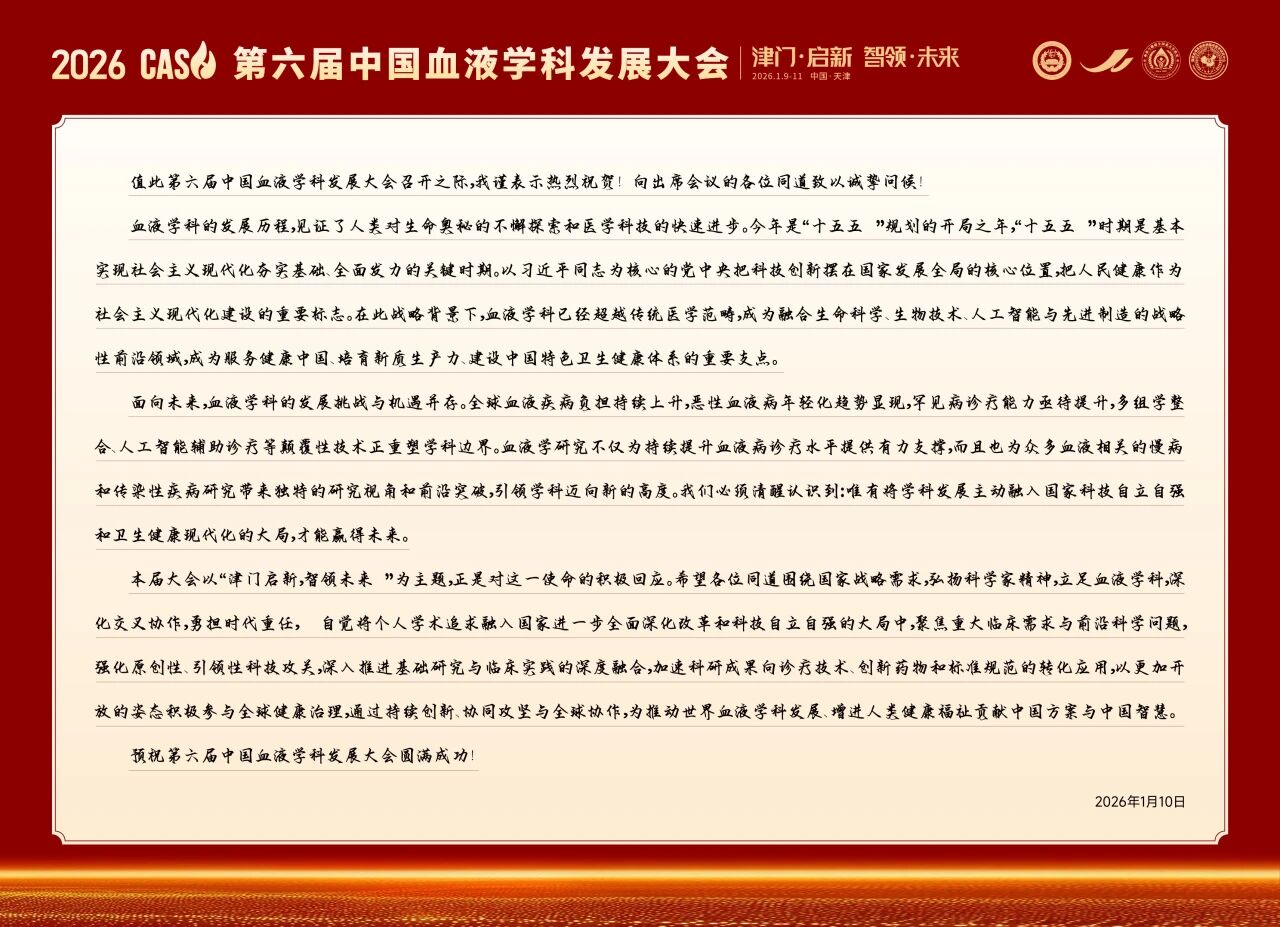 作为血液学开年盛会,本届大会在“十五五”新起点上,汇聚中国血液学者智慧,锚定中国血液学发展方向。展望未来,中国血液学科发展大会将继续紧密围绕国家战略部署,融汇学者力量,构建协同创新的“大健康”生态体系。期待学界持续聚力,产出更多突破性成果,为攻克血液疾病提供中国方案,助力健康中国建设,造福全球患者。